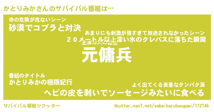 | 胡散臭い通販商品みたいなあだ名 | 『億万長者になれるブレスレット…その名も「かとりみか」』 |