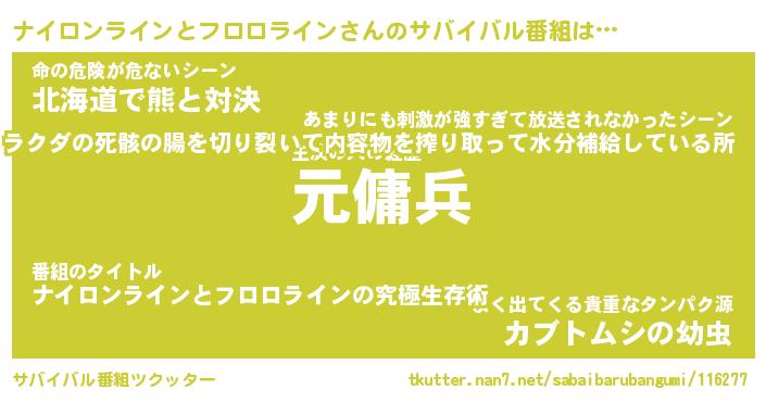 | 胡散臭い通販商品みたいなあだ名 | 『億万長者になれるブレスレット…その名も「ナイロンラインとフロロライン」』 |