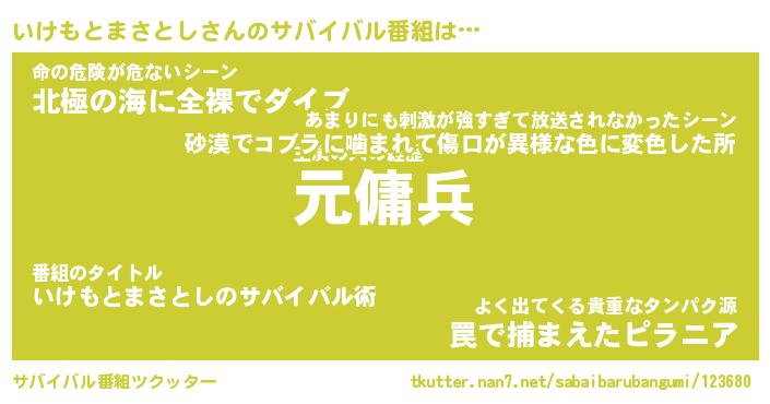 | 胡散臭い通販商品みたいなあだ名 | 『億万長者になれるブレスレット…その名も「いけもとまさとし」』 |