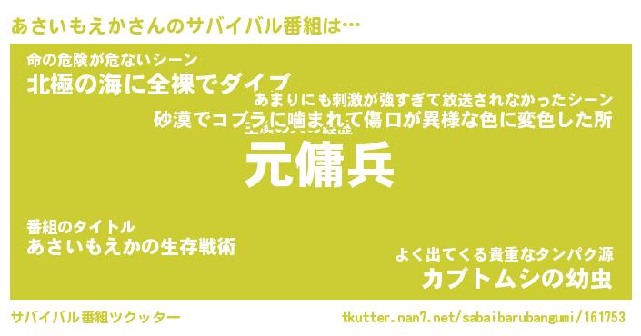 | 胡散臭い通販商品みたいなあだ名 | 『億万長者になれるブレスレット…その名も「あさいもえか」』 |