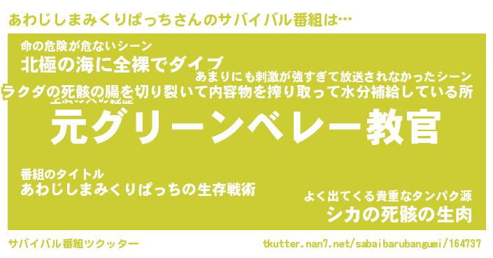 | 伝説のあだ名 | 『不死鳥のスナイパーあわじしまみくりぱっち』 |