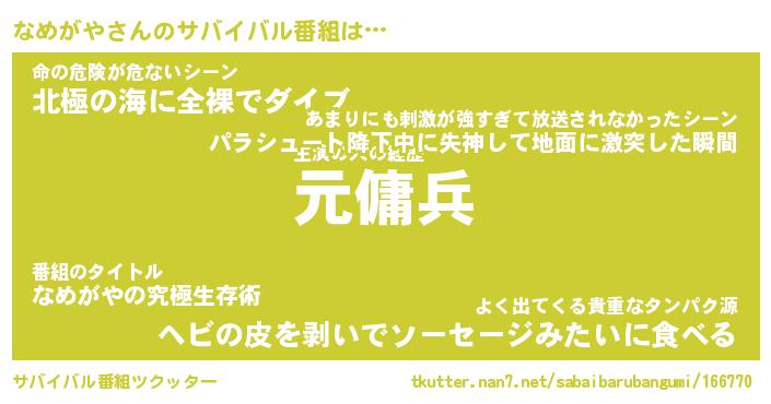 | ヒーロー風カッコイイあだ名 | 『スーパーナメガヤ』『幻影騎士ナメ』 |