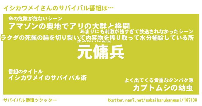 | ヒーロー風カッコイイあだ名 | 『スーパーイシカワメイ』『黄金騎士イシ』 |