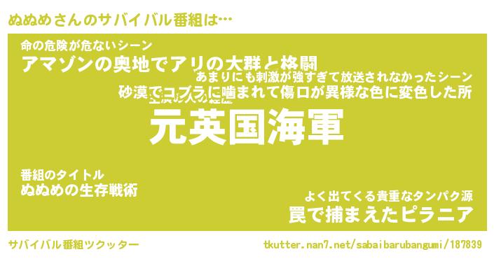 | 伝説のあだ名 | 『伝説のスナイパーぬぬめ』 |