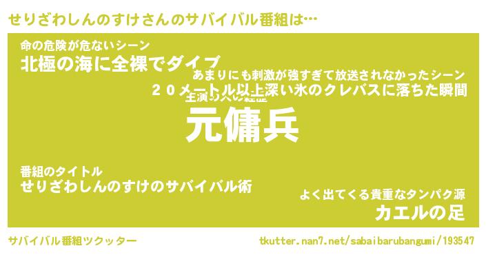 | 胡散臭い通販商品みたいなあだ名 | 『億万長者になれるブレスレット…その名も「せりざわしんのすけ」』 |