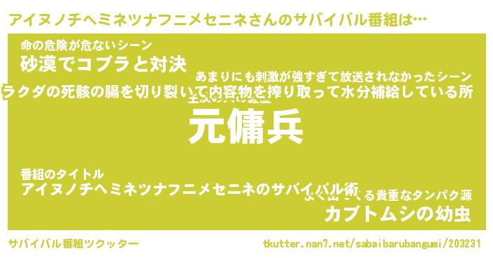 | 欧米人風あだ名 | 『マイケルアイヌノチヘミネツナフニメセニネ』 |