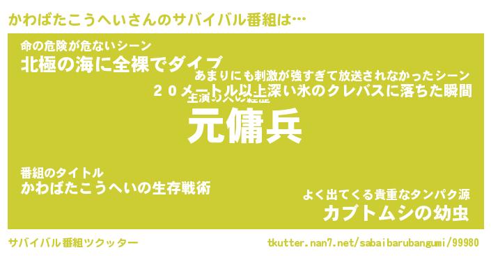 | 胡散臭い通販商品みたいなあだ名 | 『億万長者になれるブレスレット…その名も「かわばたこうへい」』 |