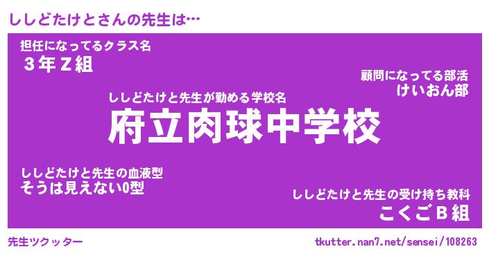 | ヒーロー風カッコイイあだ名 | 『スーパーシシドタケト』『暗黒騎士シシ』 |