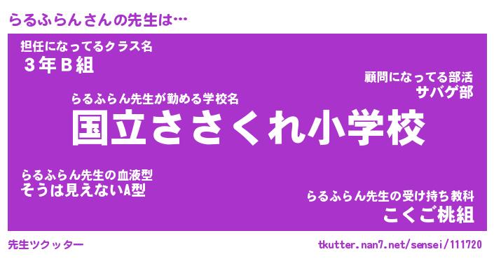 | ヘコむあだ名 | 『らるもー』『つくし』『らる太郎』 |