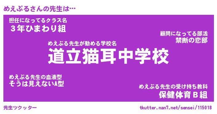 | 学校 | めえぷる校長が勤める学校の名前『都立男子メラメラ中学校』 |
