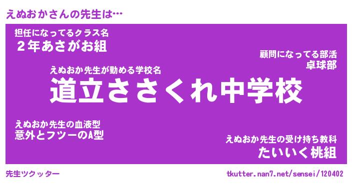 | 意味不明あだ名 | 『ペロリンえぬおか』『永久保存えぬおか』 |