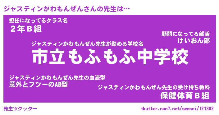 | 男性向けラノベタイトル風あだ名 | 『ジャスティンかわもんぜんの憂鬱』 |