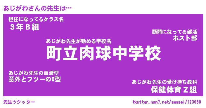 | 意味不明あだ名 | 『ペロリンあじがわ』『永久保存あじがわ』 |