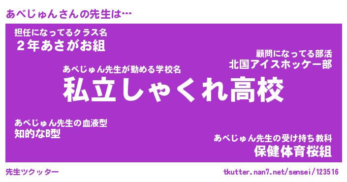 | 肩書あだ名 | 『あべじゅん御曹司』『あべじゅん教頭』 |
