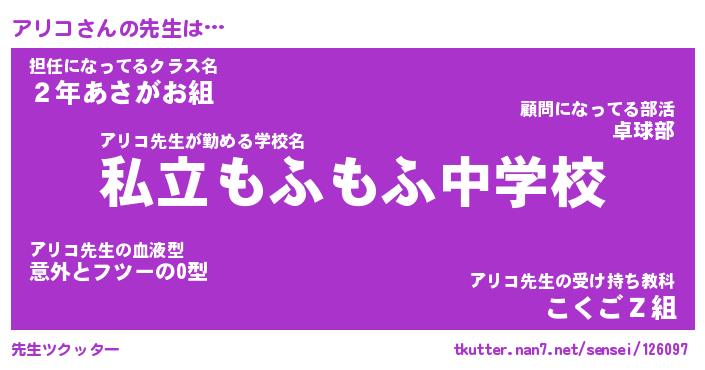 | 意味不明あだ名 | 『ペロリンアリコ』『アリコフォーエバー』 |