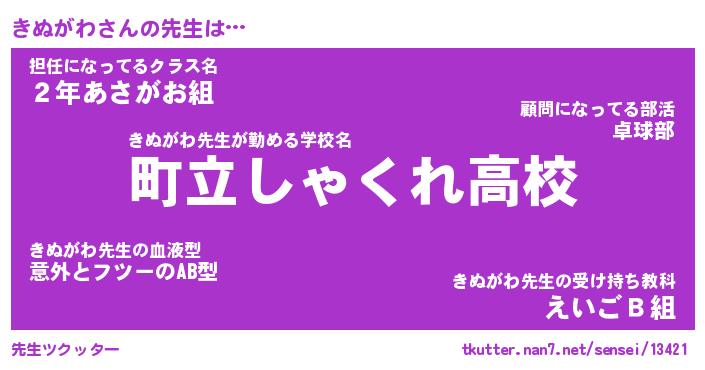 | 意味不明あだ名 | 『ペロリンきぬがわ』『永久保存きぬがわ』 |