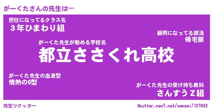 | 意味不明あだ名 | 『ペロリンがーくた』『永久保存がーくた』 |