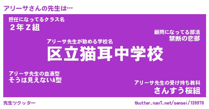 | 肩書あだ名 | 『アリーサ社長』『アリーサ総理大臣』 |