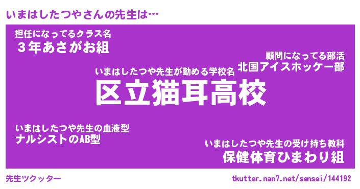 | 恥ずかしいあだ名 | 『プリティーいまはしたつや』『いまちん』 |