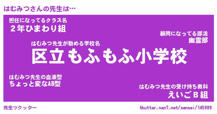 | 意味不明あだ名 | 『ペロリンはむみつ』『永久保存はむみつ』 |