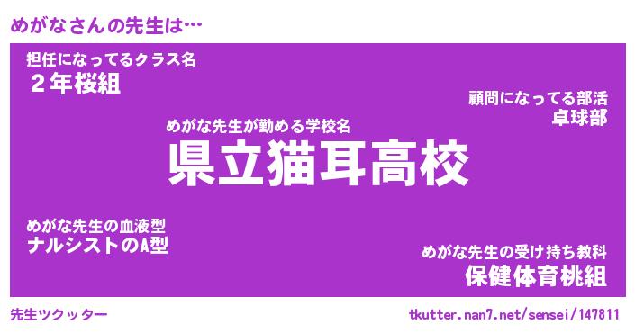 | ヘコむあだ名 | 『めがにー』『酢こんぶ』『めが太郎』 |