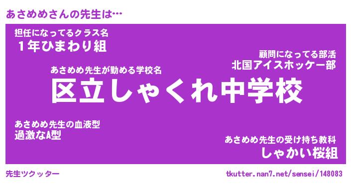 | 意味不明あだ名 | 『ペロリンあさめめ』『永久保存あさめめ』 |