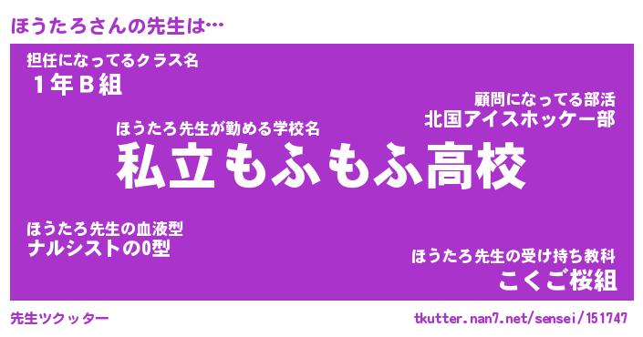 | 意味不明あだ名 | 『ペロリンほうたろ』『永久保存ほうたろ』 |