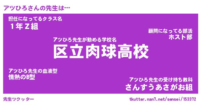 | 意味不明あだ名 | 『ペロリンアツひろ』『永久保存アツひろ』 |