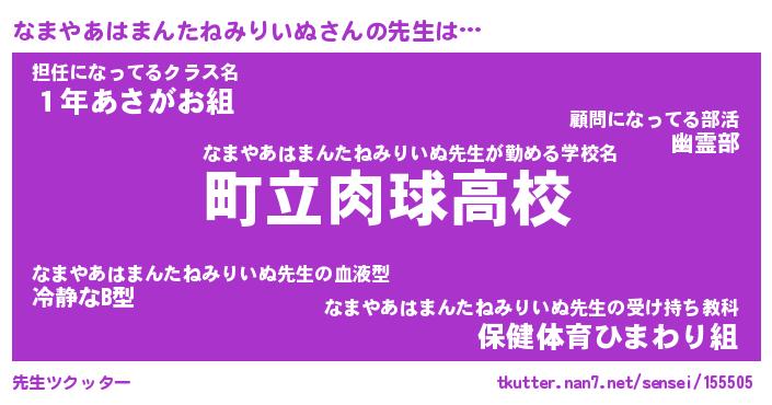 | ポケモン風あだ名 | 『ナマチュウ』『ナマヤダネ』 |