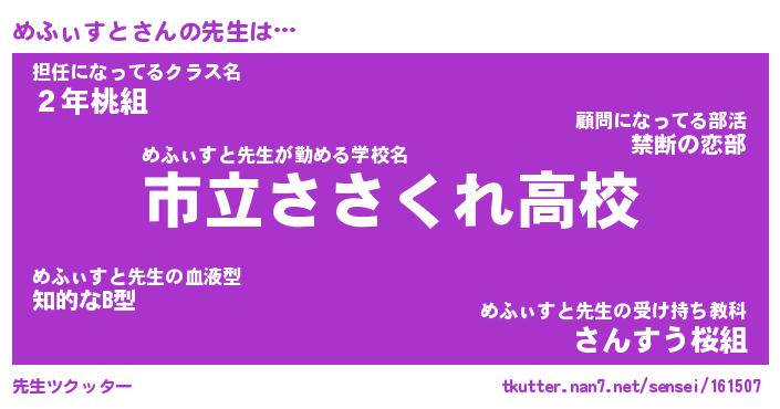 | 肩書あだ名 | 『めふぃすと社長令嬢』『めふぃすと担任』 |