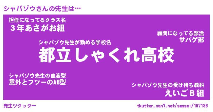 | ファンタジー風あだ名 | 『シャフェル』『エターナルシャバゾウー』 |