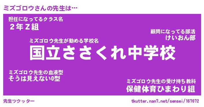 | ファンタジー風あだ名 | 『ミズフェル』『エターナルミズゴロウー』 |