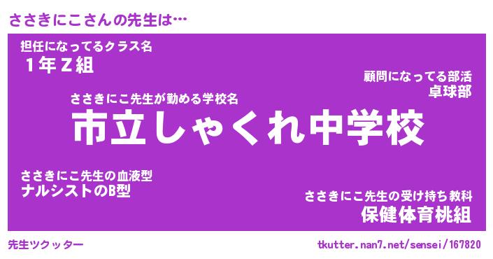 | 肩書あだ名 | 『ささきにこ御曹司』『ささきにこ教頭』 |