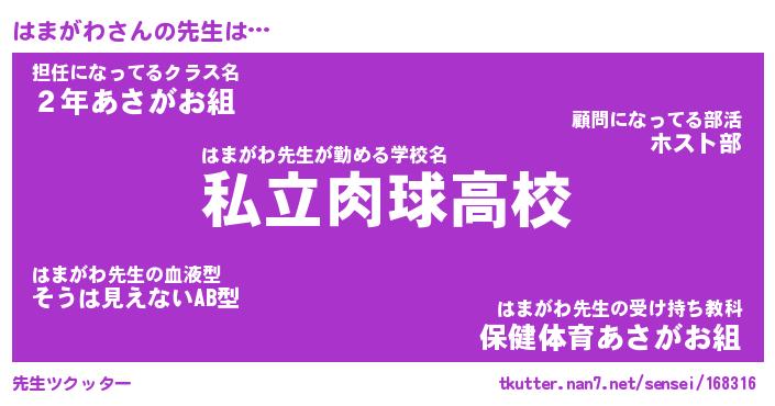 | 意味不明あだ名 | 『ペロリンはまがわ』『永久保存はまがわ』 |