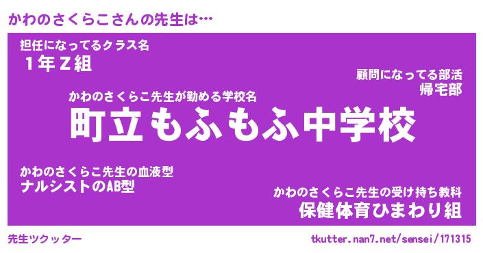 | ヘコむあだ名 | 『かわにゅー』『つくし』『かわ太郎』 |