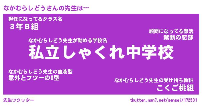| 男性向けラノベタイトル風あだ名 | 『なかむらしどうの憂鬱』 |