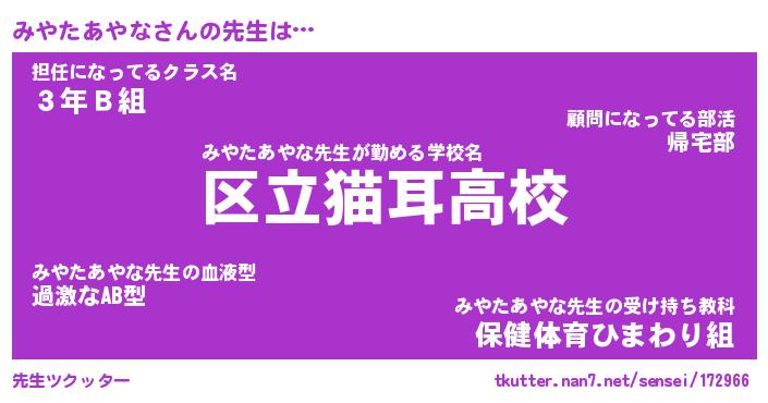 | ヒーロー風カッコイイあだ名 | 『スーパーミヤタアヤナ』『炎刃騎士ミヤ』 |