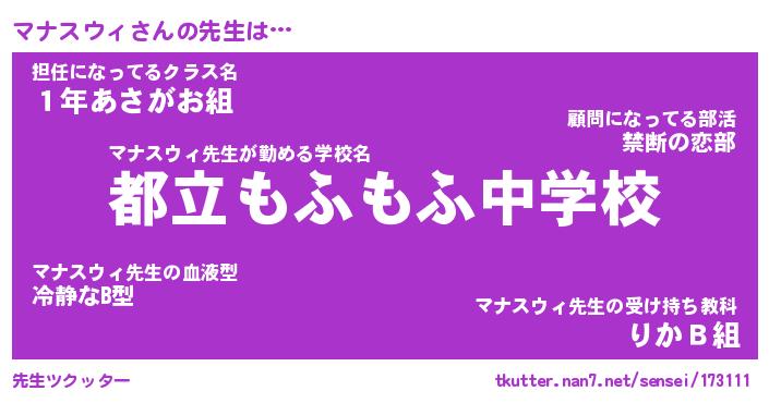 | 男性向けラノベタイトル風あだ名 | 『マナスウィの憂鬱』 |
