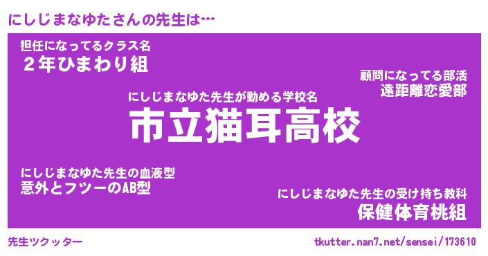 | ポケモン風あだ名 | 『ニシチュウ』『ニシジダネ』 |