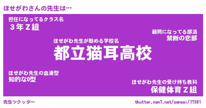 | 意味不明あだ名 | 『ペロリンほせがわ』『永久保存ほせがわ』 |