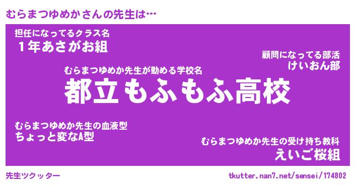 | 男性向けラノベタイトル風あだ名 | 『むらまつゆめかの憂鬱』 |