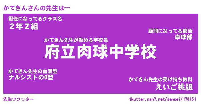 | 意味不明あだ名 | 『ペロリンかてきん』『永久保存かてきん』 |