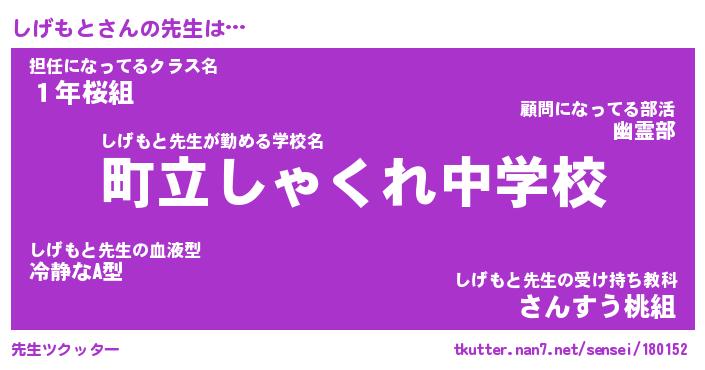 | 肩書あだ名 | 『しげもと御曹司』『しげもと国家主席』 |