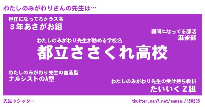 | 自動車の名前っぽいあだ名 | 『ワタティマ』『ワスラー』『ワント』 |
