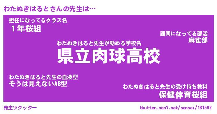 | 男性向けラノベタイトル風あだ名 | 『わたぬきはるとの憂鬱』 |