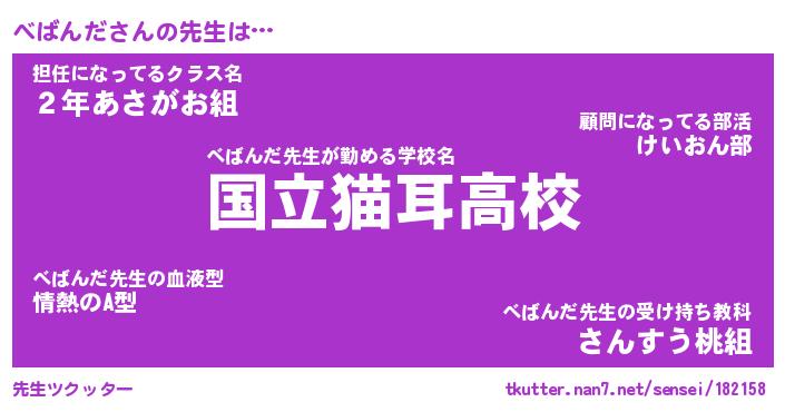 | 意味不明あだ名 | 『ペロリンべばんだ』『永久保存べばんだ』 |
