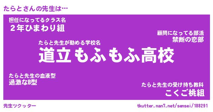 | 意味不明あだ名 | 『ペロリンたらと』『たらとフォーエバー』 |