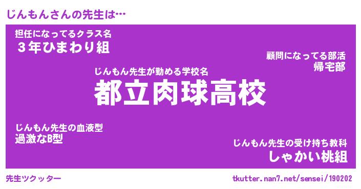 | 意味不明あだ名 | 『ペロリンじんもん』『永久保存じんもん』 |