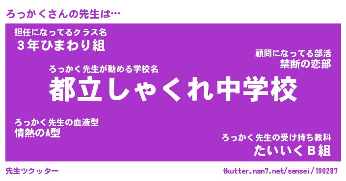 | 意味不明あだ名 | 『ペロリンろっかく』『永久保存ろっかく』 |