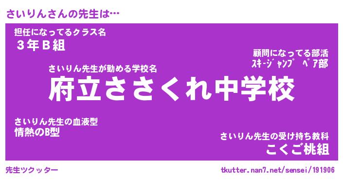 | 意味不明あだ名 | 『ペロリンさいりん』『永久保存さいりん』 |